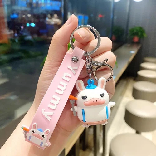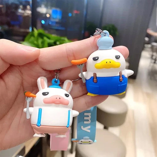 Porte-Clefs Résine et PVC canard blanc déguisé en loin fermier avec une fourche et une carotte 🥕 pour préparer un BBQ végétarien